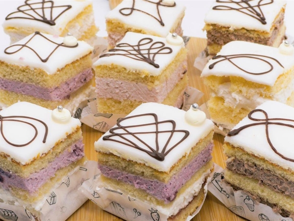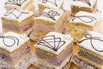 Heerlijk zacht mini gebakje van laagjes cake met bavaroisvulling naar keuze, bedekt met een laagje fondant en stijlvol gedecoreerd.